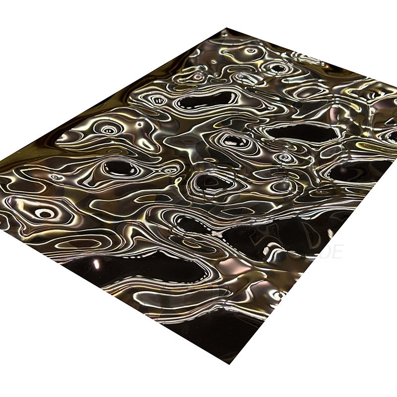 | التطبيق: ورقة منقوشة من الفولاذ المقاوم للصدأ بنمط تموجات المياه متوسطة الحجم بطلاء PVD باللون الذهبي الوردي بلمسة نهائية عاكسة |